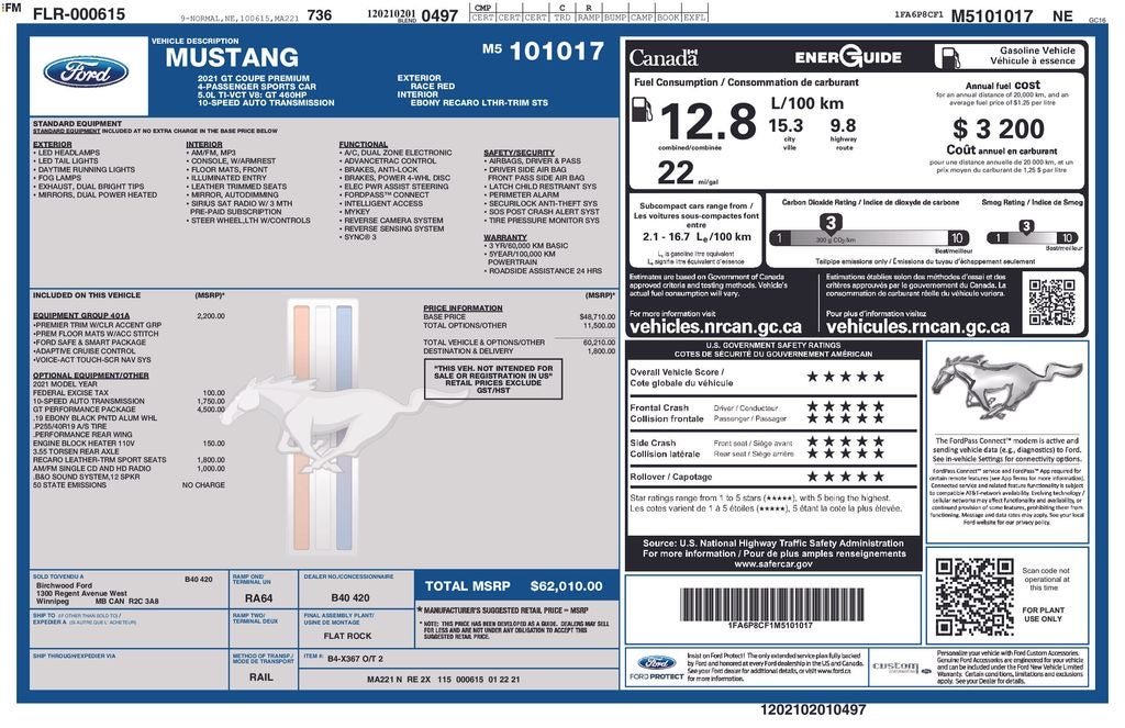 2021 Ford Mustang GT RWD 5.0L V8 Ti-VCT 10-Speed Automatic 2D Coupe Race Red